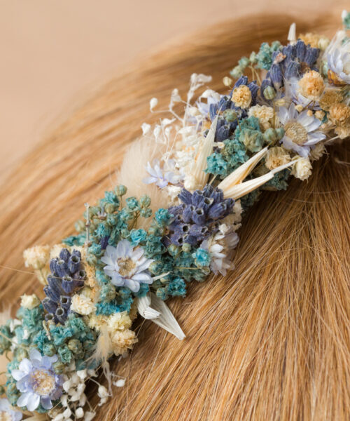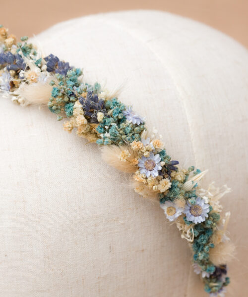 und anderen filigranen, zarten Trockenblumen auf einem Haarreif gebunden.