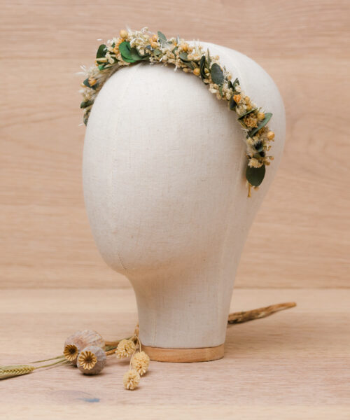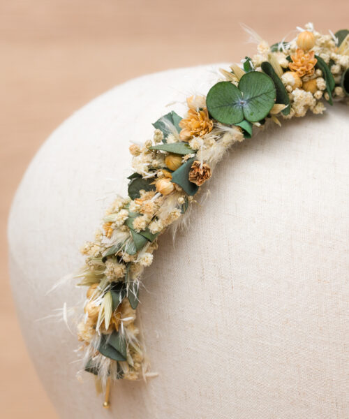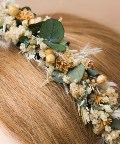 und anderen filigranen, zarten Trockenblumen auf einem Haarreif gebunden.