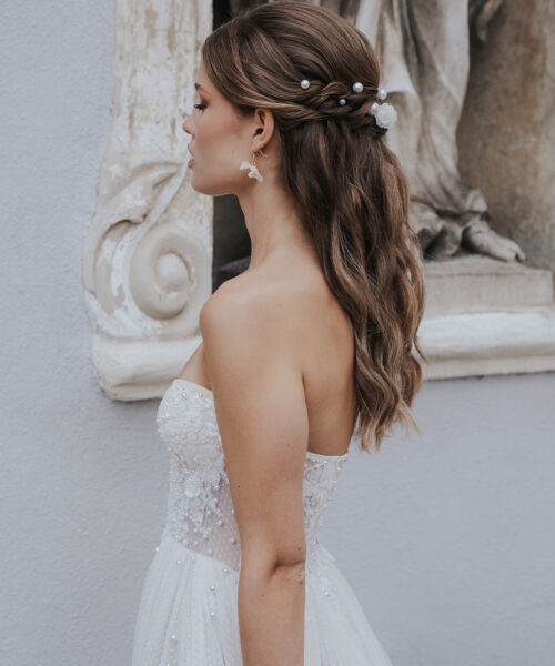 Ein echter Blumen Haarschmuck matched perfekt zum cleanen, ebenfalls zum romantischen Brautkleid