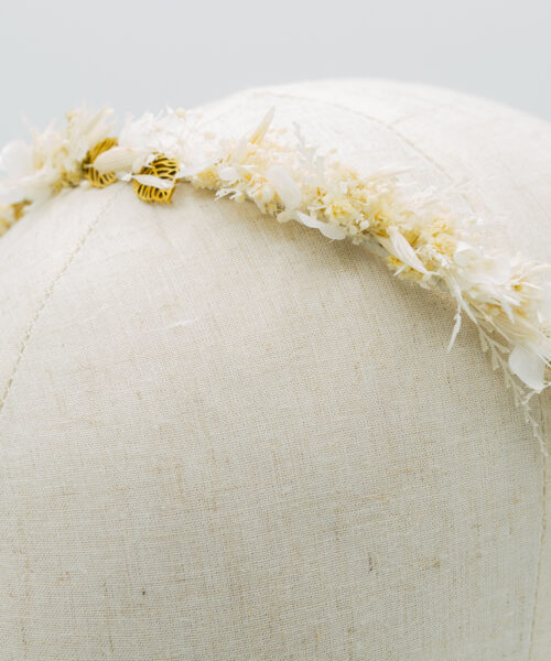 Diese Blumenkrone ist mit feinen stabilisierten, getrockneten Blüten gebunden. Zarte, goldfarbene, metallische Blätter wurden